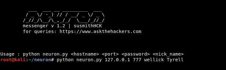 Now run the client neuron.py script to set the hostname, port, password for the chat room by the command python neuron.py .