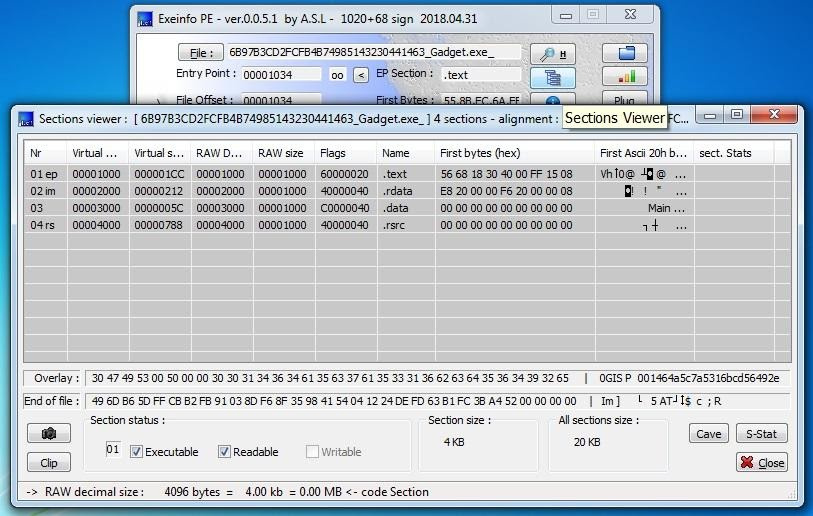 Section viewer: This field show us different sections of the file. And tells us which section is Executable, Readable and Writable.