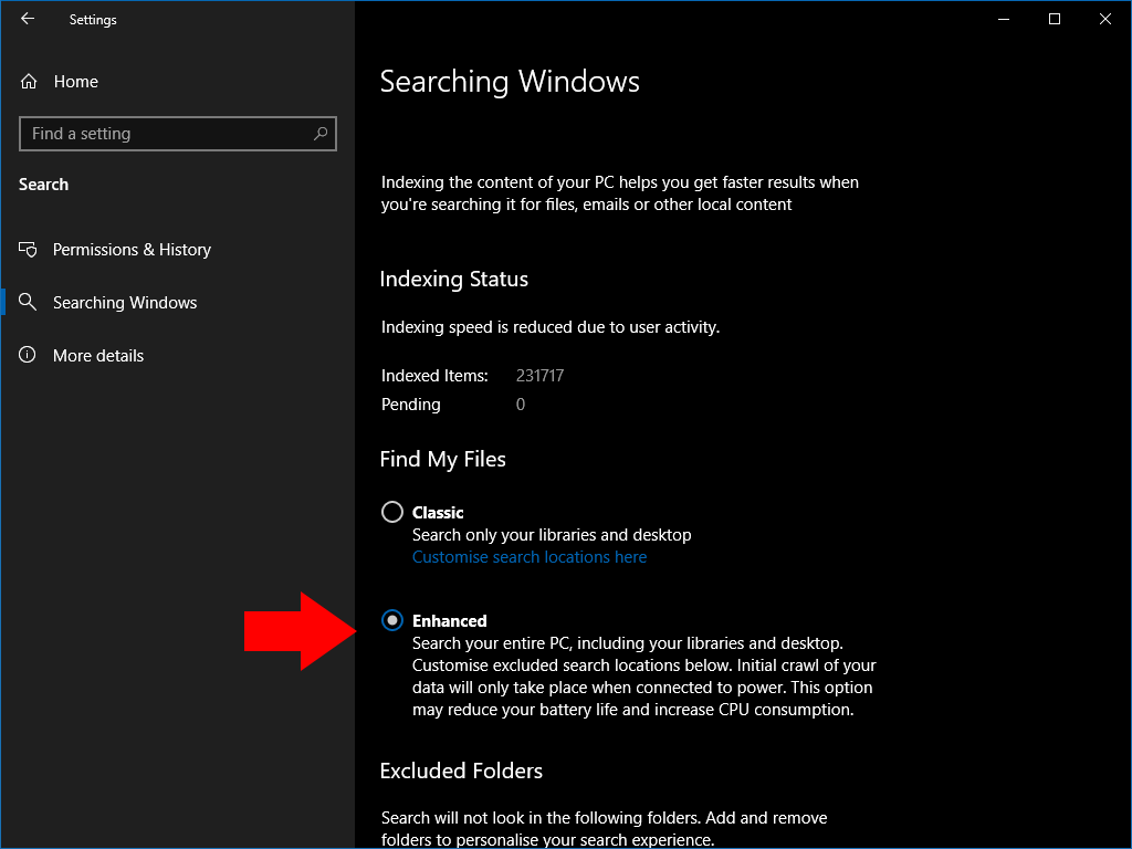 Enhanced search will now be turned on. If this the first time you’ve used it, Windows will commence indexing your files. You can track the progress under the “Indexing Status” heading.