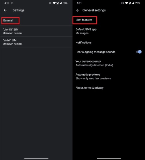 Note: In some single SIM devices (or dual SIM devices in which you are using only a single SIM card), âChat featuresâ option is showing right inside the âSettingsâ page. In those cases you wonât need to go inside any General option.