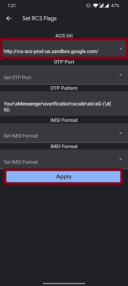 - Right under the ACS URL section, choose â âhttp://rcs-acs-prod-us.sandbox google.com/.â And then, tap on Apply .
