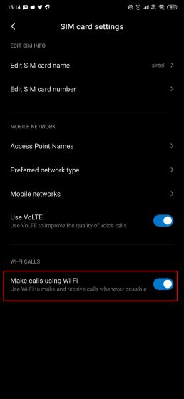 Enable VoWiFi on your Xiaomi device from MIUI, go to Settings → SIM cards and mobile networks → Jio or Airtel → Enable the toggle for “Make calls using WiFi”. Following that, a WiFi-call icon would appear in the status bar.