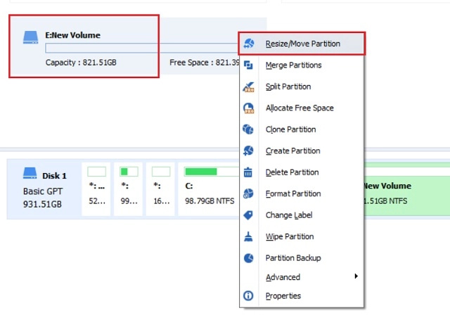 - Right-click on any drive that has available storage and select “Resize/Move Partition”. In case, you are coming from the above section then choose the new partition that you created earlier through simple volume.