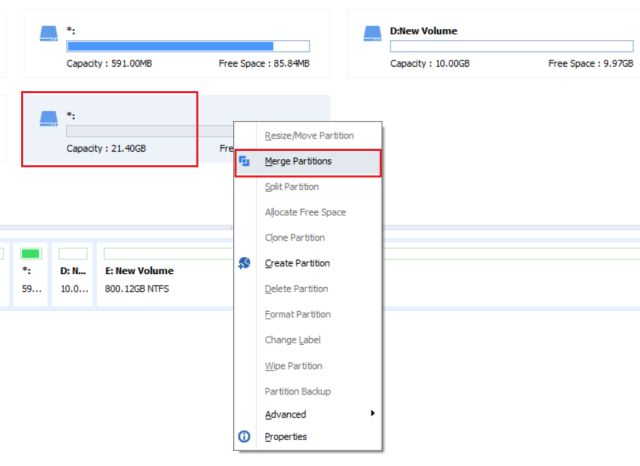 - Next, right-click on the newly-formed drive having a storage of 21GB (in my case) and select “Merge Partitions”. By the way, this partition is called the unallocated drive.