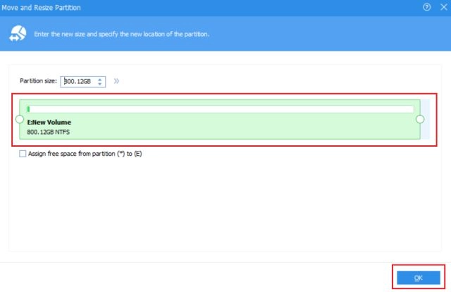 - Next, using the slider, choose how much memory you want to keep in the existing drive and click on the “Ok” button. For example, I have kept approx 800GB from 821GB which means I am taking out 21GB from the existing drive. I want to merge this 21GB with C Drive. You can choose your own storage space.