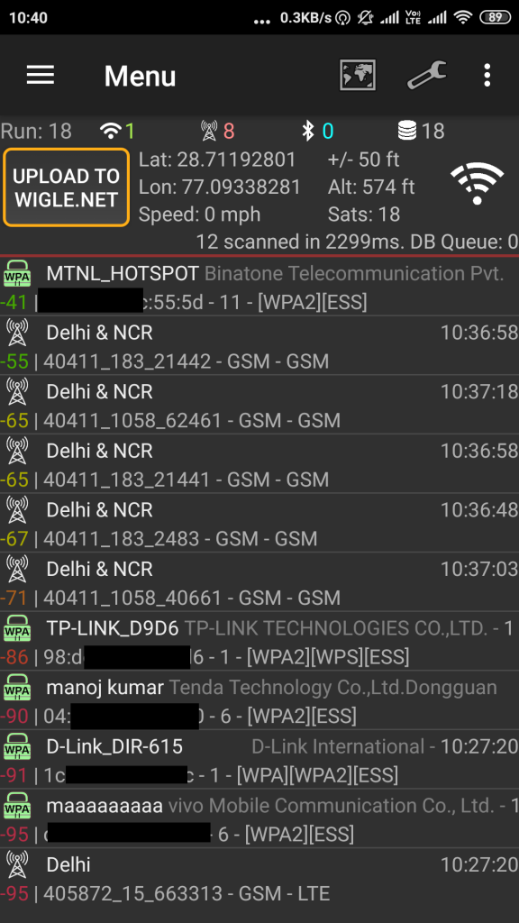 - Wigle has automatically started scanning the local wifi hotspots . Wigle has also ability to show local mobile towers.