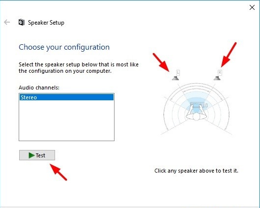 In the next window, click on the Test button and it will play sound on left and right speakers alternatively. You can also click on the individual speaker icons to manually play sound on them.