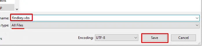 Save your coding file with the name of “findkey.vbs” . Must remember that the extension should be the “.vbs” otherwise it will not open the file. Now carefully, select the “All Files” option instead of “Text Document.” Save the file to wherever you wat to save it.