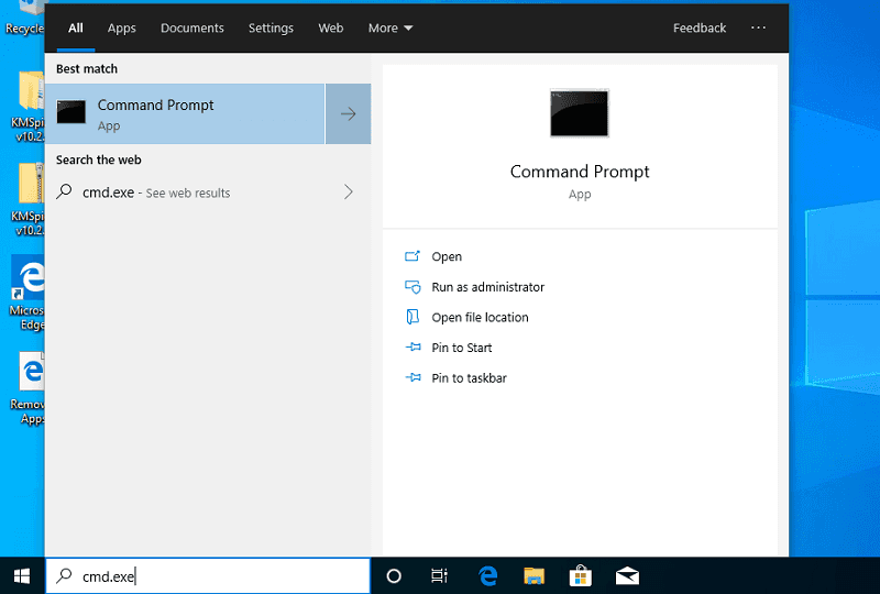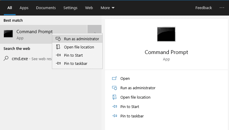 At first, we have to start the Command Prompt with administrative privilege. From the Start menu, search for “cmd.exe” (without quotes).