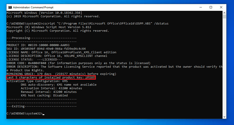 Windows 32-bit, Office 2016 32-bit: `cscript "C:\Program Files\Microsoft Office\Office16\OSPP.VBS" /dstatus`