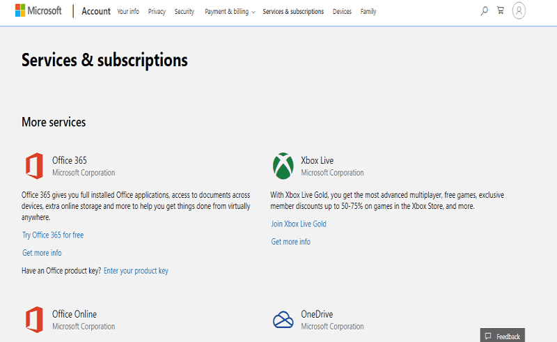 At first, go to this Microsoft Services & Subscription page and log into your account.