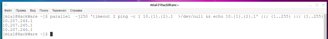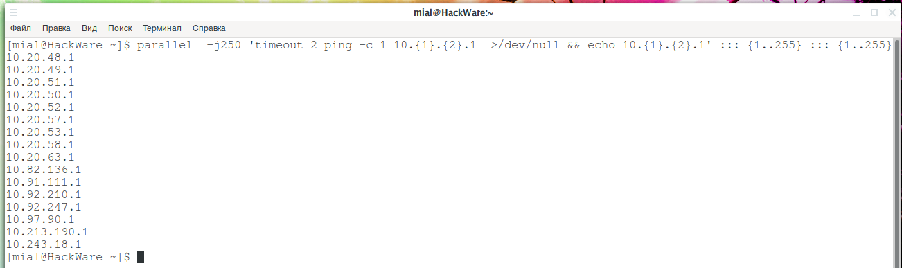 1 parallel -j250 'timeout 2 ping -c 1 10.{1}.{2}.1 >/dev/null && echo 10.{1}.{2}.1' ::: {1..255} ::: {1..255}