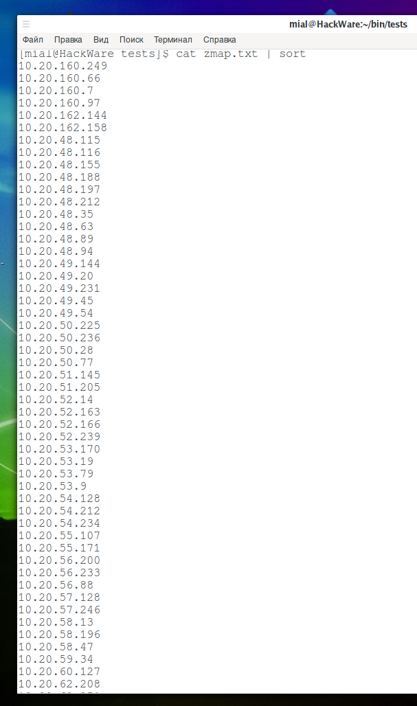 But I didn’t have to wait for almost a day until completion (via Wi-Fi scanning is slow, but I’m connected that way). The ZMap scanning algorithm is such that it will check the hosts not sequentially, but in a disparity over the entire specified range. And if users are really compactly located in certain subnets, then already in a short time (15 minutes) one can understand exactly where they are: