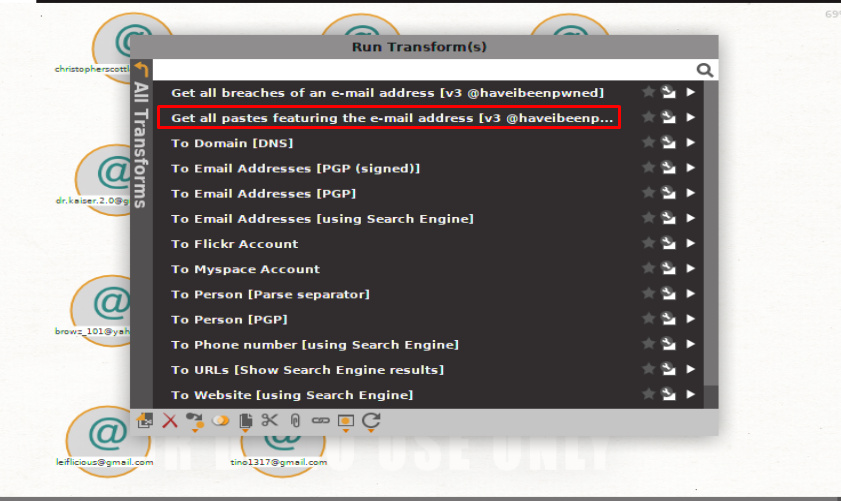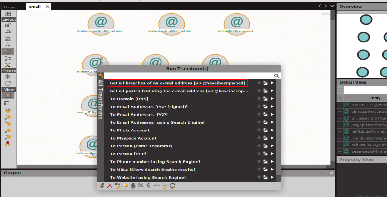 Select all the email addresses, since I have only imported 11 of them, and run the Have I been Pawned transform to check whether the target email addresses been hacked before or not. If it is not the part of any breach, then just drop it; it’s of no use.
