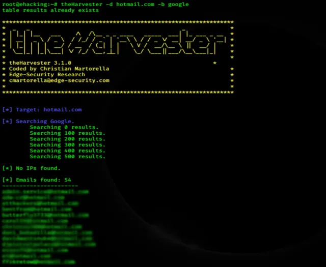 Step 1: Getting email addresses using the email harvesting tool, theHarvester