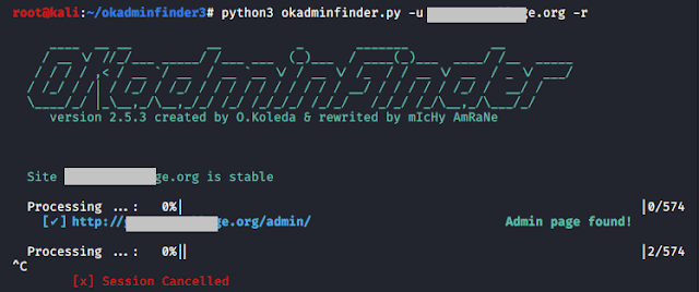 OkadminFinder . A very simple tool written in python but very useful. It scans the target website to find out the admin panel. For some websites, it finds out the admin panel in a few seconds but for websites with huge resources, it takes some time to complete its scanning process.