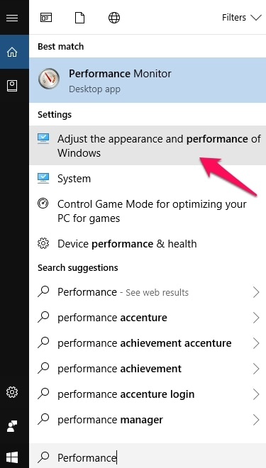 - Now, type in β Performance β. You will now observe an option β Adjust the appearance and performance of Windows β.