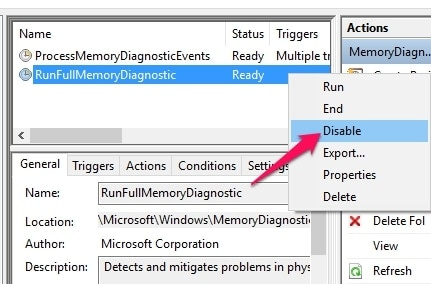 - Now, if you click on MemoryDiagnostic, you will have two tasks listed to the right. Among the tasks mentioned, right-click on RunFullMemoryDiagnosticEntry and then disable it.