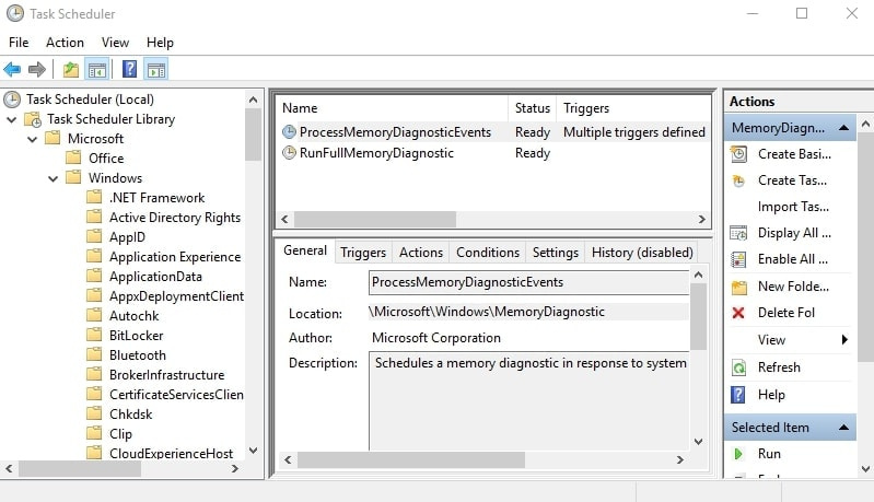 - From the left portion of the window, navigate your way through β Task Scheduler (Library) > Microsoft > Windows > MemoryDiagnostic .