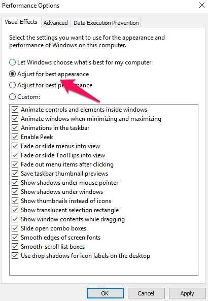 - Now, on the first tab of the Window, you just need to click on β Adjust for best performance β and Windows will automatically scrap down the unnecessary visual effects.