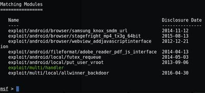 It will list the exploits available for android platform. You can get help on metasploit commands by typing help followed by a space with command name such as help search . It will print the manual for search command. Here’s the output for android exploit search: