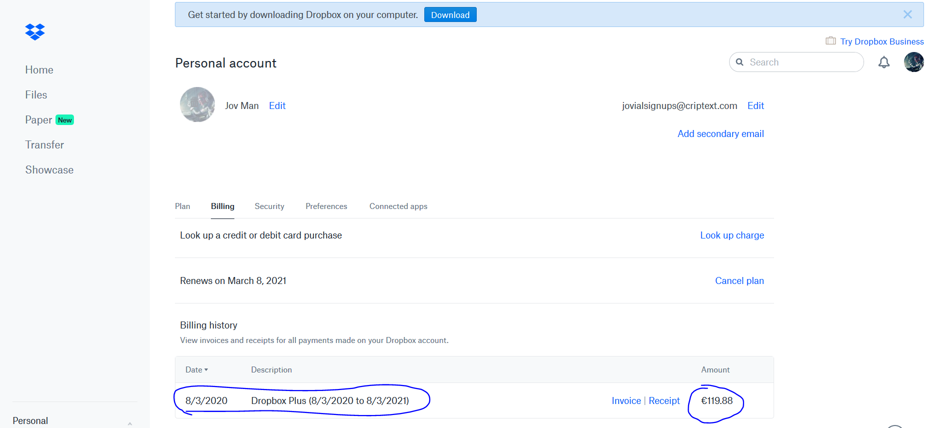 We tried multiple times but weren’t able to charge you €119.88 for your Dropbox account.