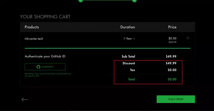 Now let’s register for the domain. I am planning to use trkrcenter.com as the startup company so i will register trkrcenter.tech. I will be using GitHub student pack for doing so.