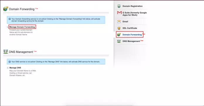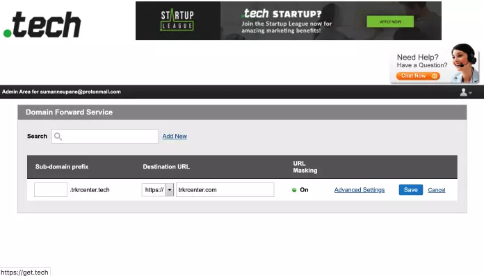 Now we got the email we have to the final configuration to our domain that is forward our domain to the main website so that when ever someone visit our website it will redirect to the original startup company domain. For that login to the control panel of get.tech and click on Domain Forwarding and click on manage domain forwarding. Then select the main domain of the startup agency and click on save.