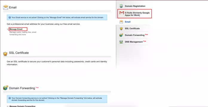 - After creating account and doing verification process go to the control panel of get.tech and select your domain name. Then go to “G Suite (formerly Google Apps for Work)” and select Manage email.
