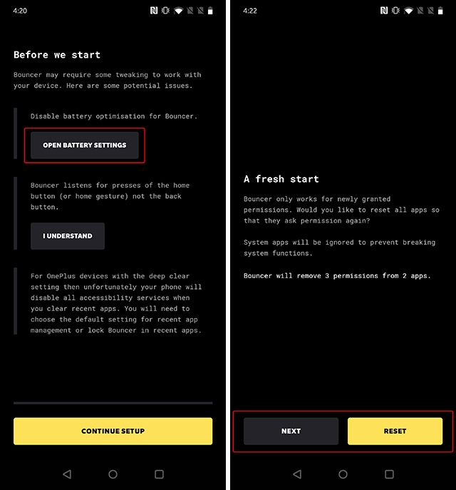 - Follow the on-screen instructions to set-up Bouncer on your phone. Bouncer only works for newly granted permissions. I would recommend that you reset your permissions for all apps using the in-app option just to make sure no app has undue access to any permissions.