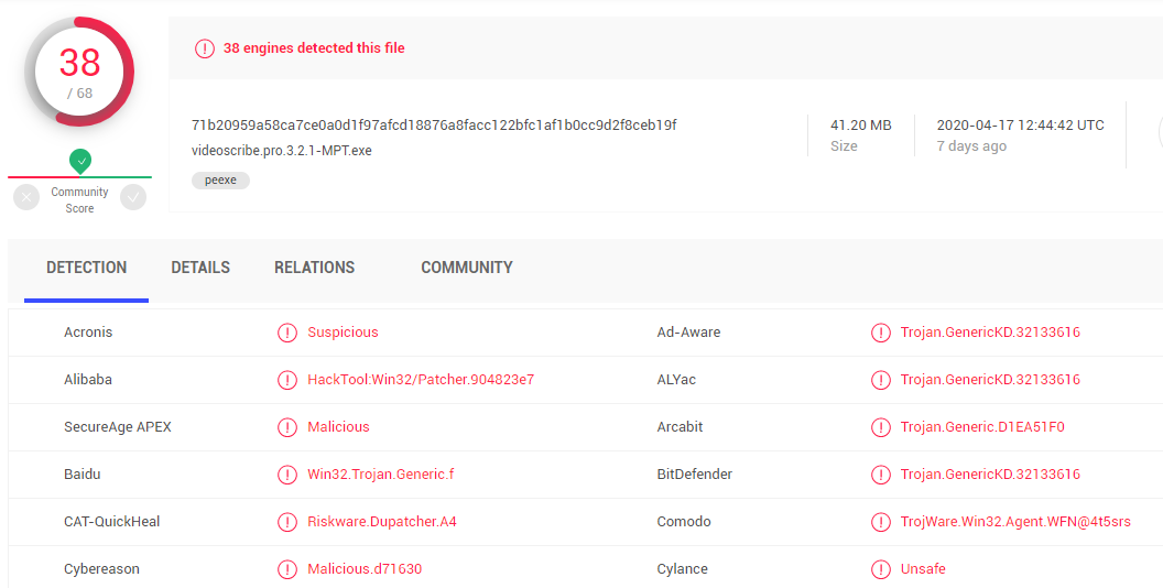 I just need a little bit of guidance. I downloaded a explainer video software “Videocribe” after unzipping the files, just quickly run the patch included in the files I downloaded and it shows me this in Virustotal. Do you think it’s safe to use this considering that 38 anti virus in VT detected it?