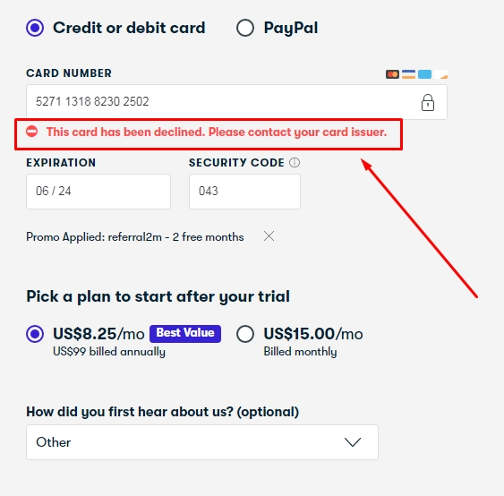 skillshare method is not working, it’s showing card is declined. please help