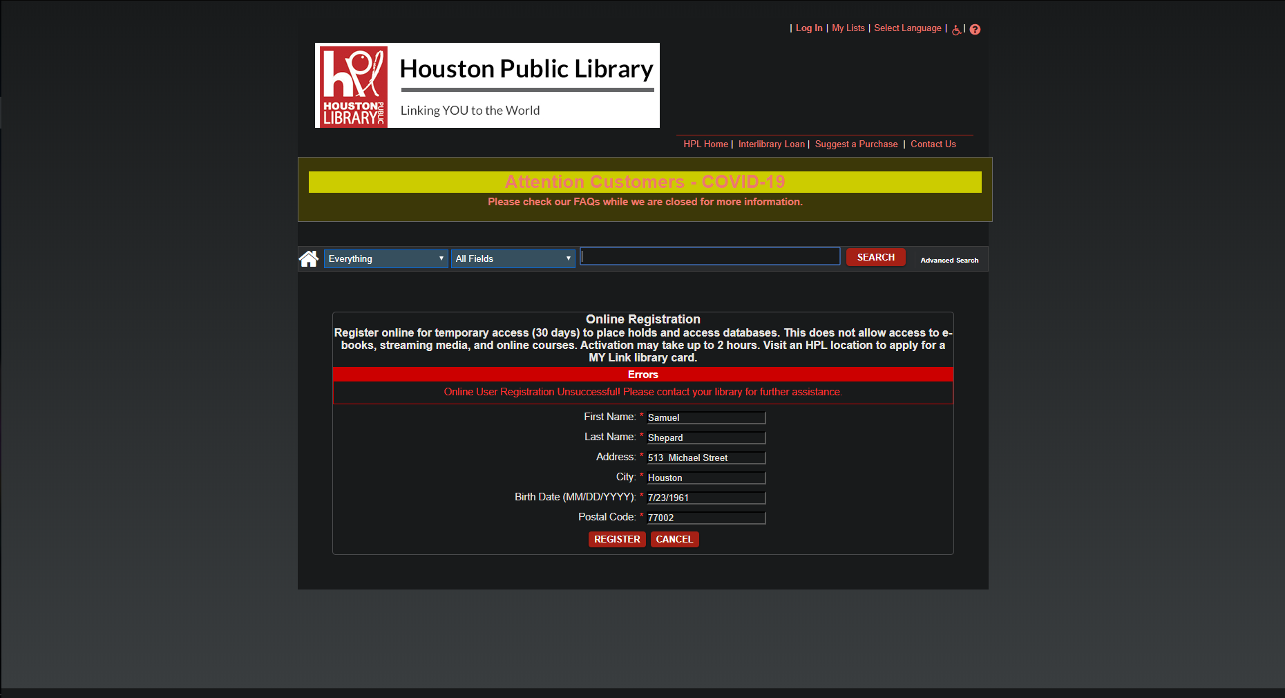 “Online User Registration Unsuccessful! Please contact your library for further assistance.”