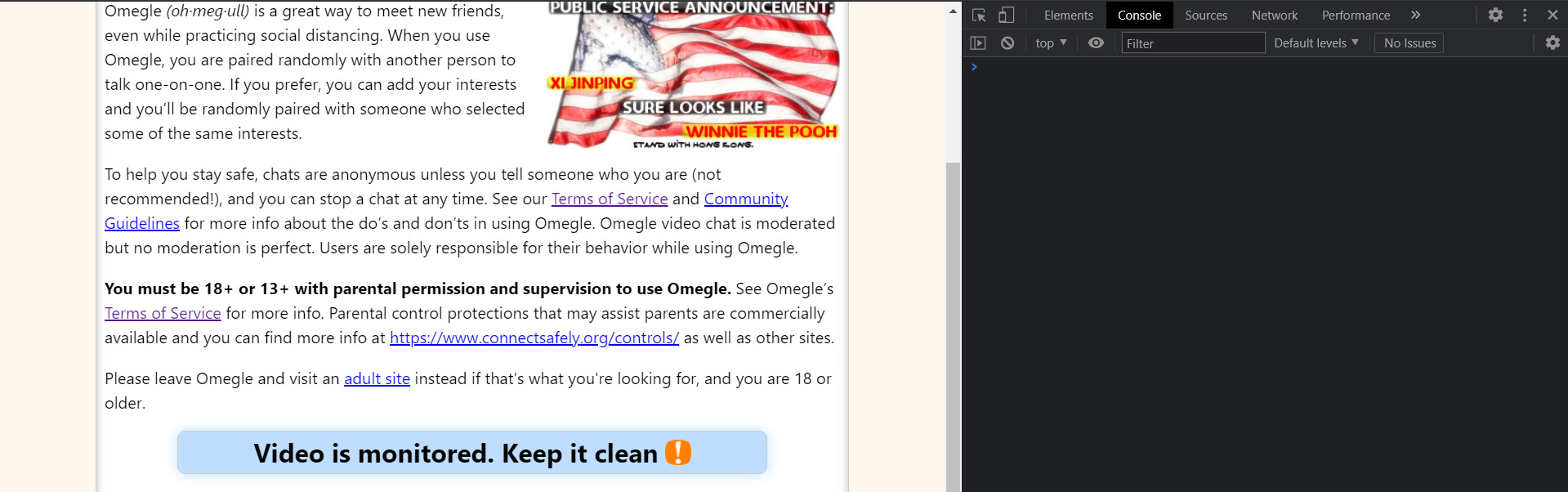 First thing firsts, go ahead into omegle.com and press f12 / inspect element to get access to the developer tool (console):