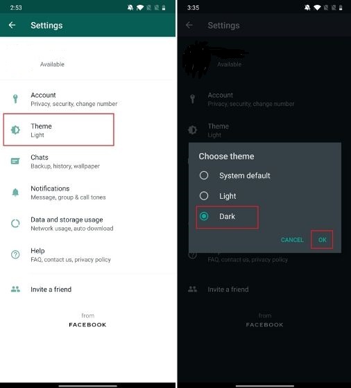 - Now that you have made the necessary changes, force stops WhatsApp and open it again . Next, open WhatsApp Settings and you will finally see the “Theme” option. Tap on it and select the “Dark” option. Voila, there you have it! Official dark mode on WhatsApp working without a hitch.