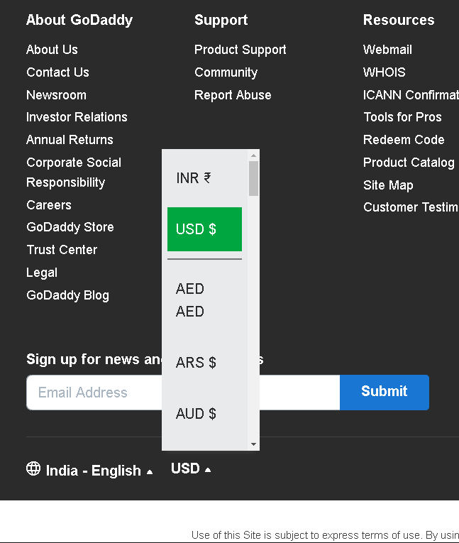 As Sam mentioned at the bottom of the Godaddy window you will find a country and currency changing option, you could possibly try your luck to find if you get a paypal option that way.