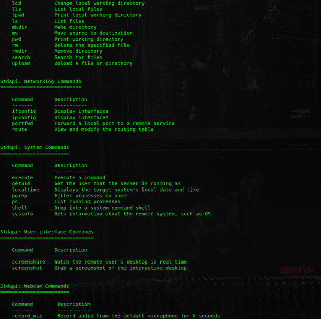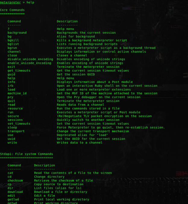 The moment the app is installed on the target’s device, the threat actor notices that a meterpreter session is now open. Typing “sysinfo” allows him to check if the operation has been successful. After confirming the positive results, he types “help” to visualize the many commands that can be executed.