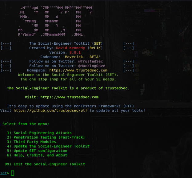 Type “1” (to select “Social-Engineering Attacks”) and press [Enter].