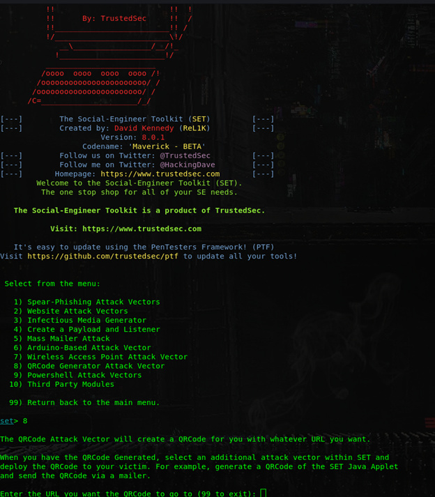 Exit SEToolkit and type “cd /root/.set/reports” to find the folder where the QR code has been saved. At this point, the threat actor must use social engineering to convince the target to scan the code.