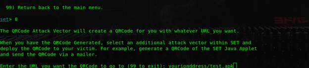 Next, type “8” (to select “QRCode Generator Attack Vector”) and press [Enter]. When requested, type the IP address you used before followed by “/” and the payload, in this case “test.apk”. The format is the following: “youripaddress/nameofthepayload.apk”.