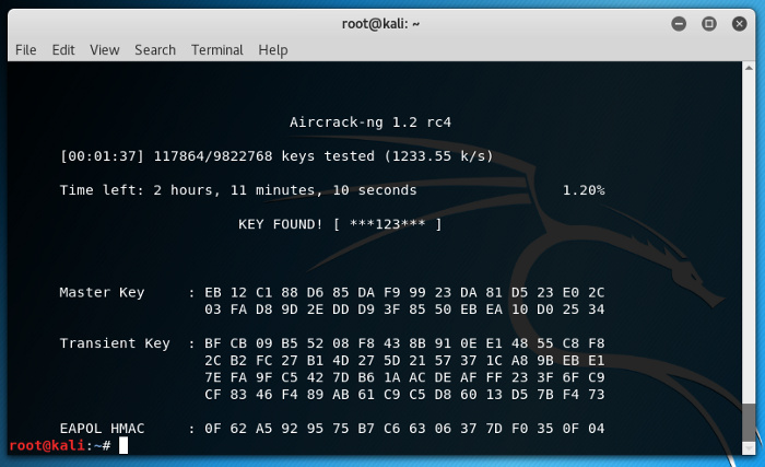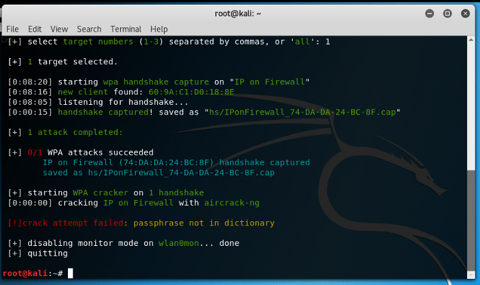 As soon, as the target was selected “ wifite ” ran the packet capture for “IP on Firewall”, it found the hosts connected to it and sent out de-auth packets for a few moments till the time the device was disconnected. Once the device got disconnected, the device tried to connect back to the WiFi router and during this process “ wifite ” captured the packet with the password for the WiFi in encrypted form.