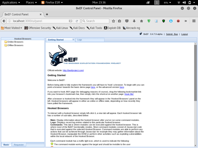 - Once you have logged into BeEF Web GUI you can see a section on the left âHooked Browsersâ Online Browsers and Offline Browsers. This section shows victims hooked status.