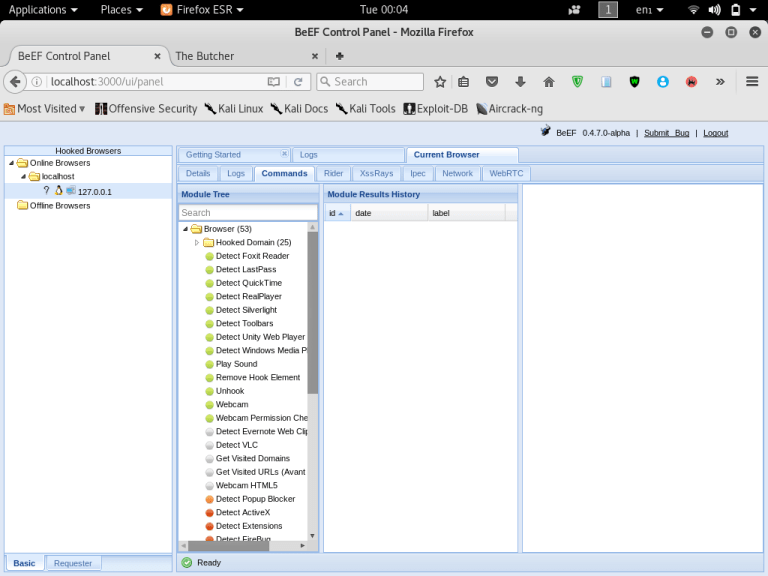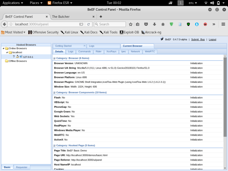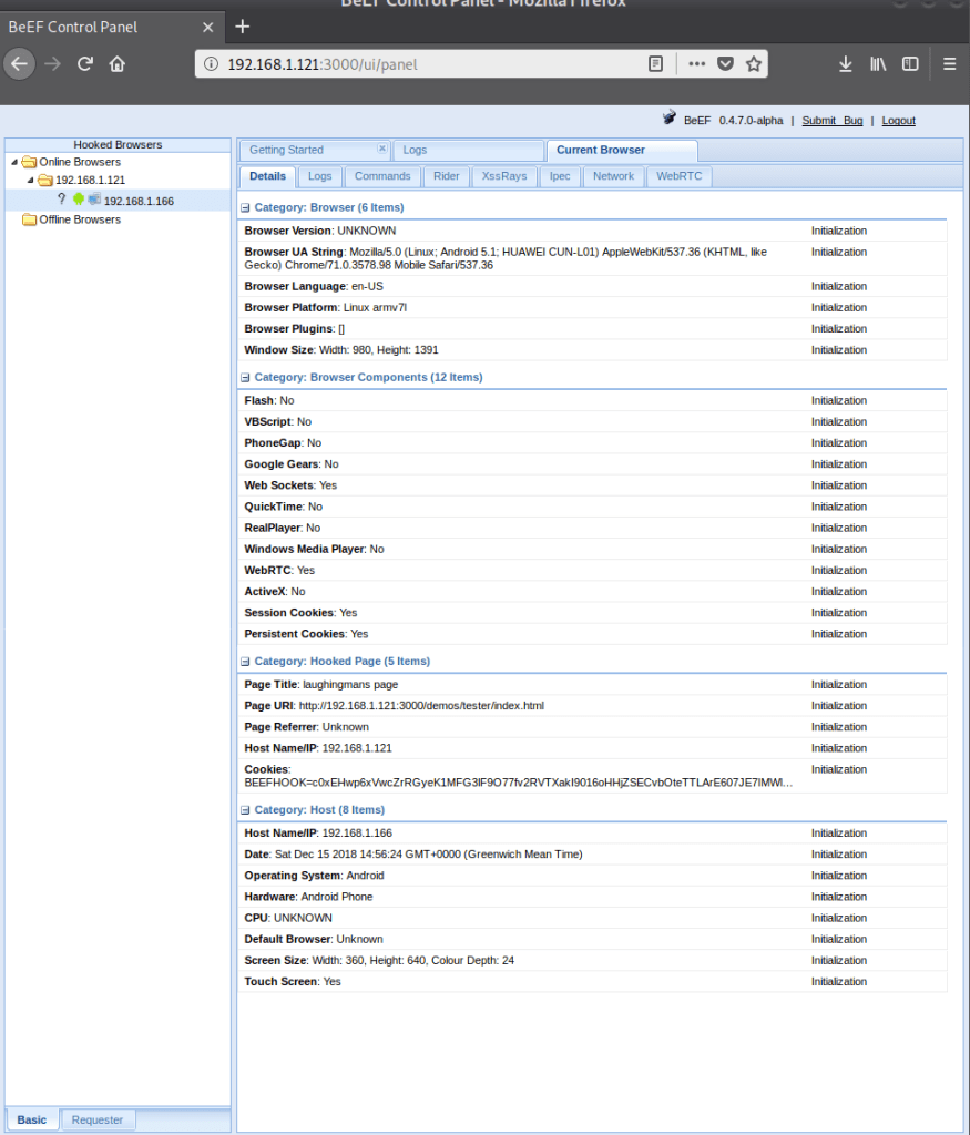 - In the screen shot below we can see BeEF has hooked a target browser and its online from here we can find out information such as The Browsers version plug ins that the browser is using and various information about the target system and its software.