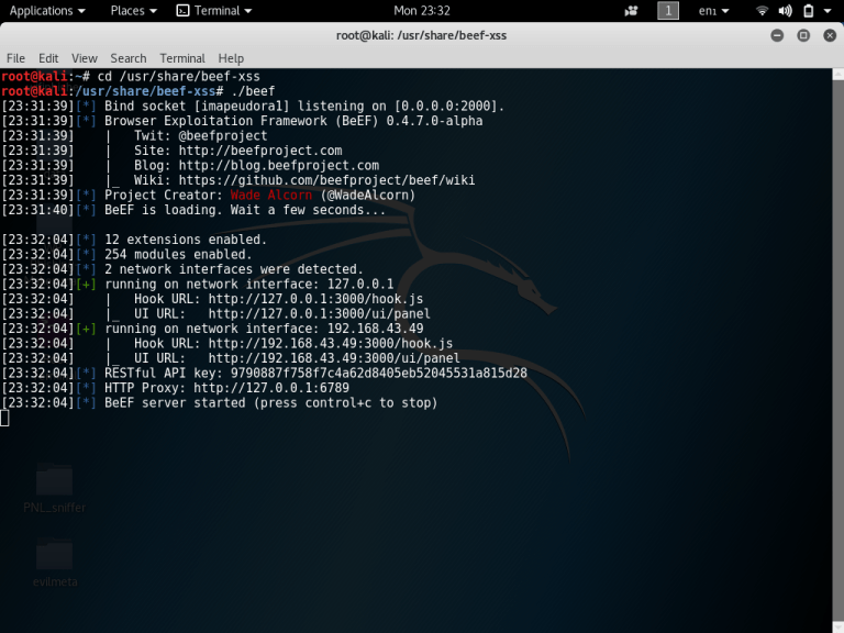 BeEF hook http://192.168.43.49:3000/hook.js.