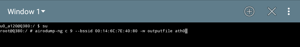 - airodump-ng -c 9 --bssid 00:14:6C:7E:40:80 -w outputfile ath0