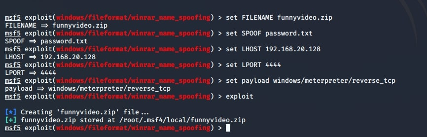 set FILENAME funnyvideo.zip set SPOOF password.txt