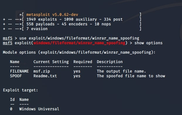 Step 2: Once msfconsole is open, type the following command to select the winrar_name_spoofing vulnerability